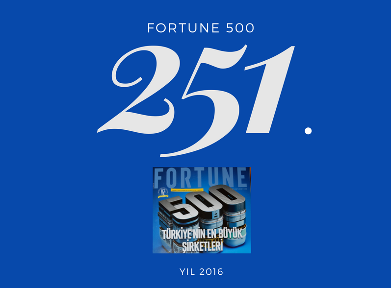 Türkiye’nin en büyük 500 şirketini net satış rakamlarına göre sıralayan ve bu yıl 10’uncusu yayınlanan “Fortune 500 Türkiye” araştırmasına göre, şirketimiz 2016 yılı finansal verileriyle Türkiye’nin en büyük 500 şirketi listesinde 10 basamak yükselerek 251. Sıraya yükseldi.